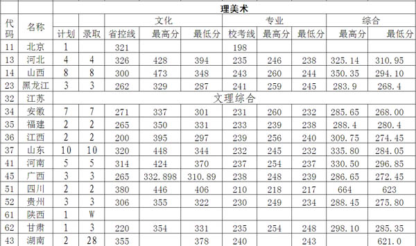 錄取規(guī)則:美術類考生,文化成績達到所在省(直轄市、自治區(qū))藝術類錄取分數(shù)線,專業(yè)通過我校組織的專業(yè)??记页煽兒细瘢ê鲜∷囆g類專業(yè)考生須參加全省專業(yè)統(tǒng)考且成績合格),文化、專業(yè)成績按4.5:5.5的比例計總分排序錄取,總分相同時,英語成績高的考生優(yōu)先錄取。錄取時按美術文、美術理分別錄取。