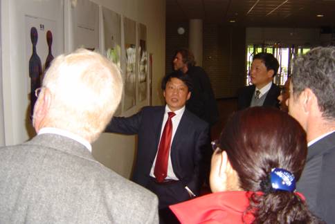 (圖為:湖北工業(yè)大學校長熊健民教授、德國杜塞爾多夫科技大學校長克勞澤博士、德國設(shè)計大師哈跟拜格教授、烏韋勒斯教授等聽取院長許開強教授的介紹。)