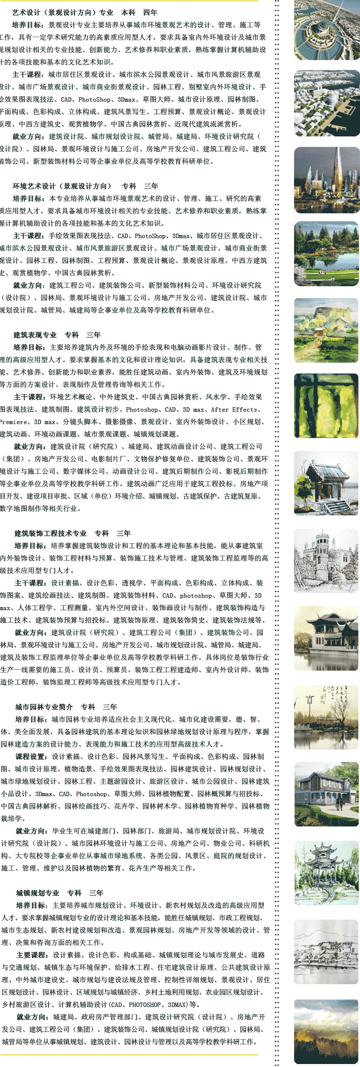 本專業(yè)方向培養(yǎng)從事環(huán)境景觀藝術(shù)設(shè)計、管理、教學(xué)、研究等方面的具有較高理論知識和實踐能力,以及較強(qiáng)計算機(jī)輔助設(shè)計水平的高素質(zhì)、復(fù)合型、適應(yīng)市場需求的高級專業(yè)人才。