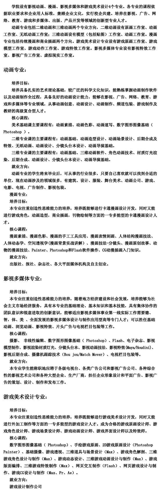 傳媒學(xué)院現(xiàn)有視覺傳達(dá)藝術(shù)設(shè)計、電腦藝術(shù)設(shè)計 、廣告設(shè)計與制作、計算機(jī)應(yīng)用基礎(chǔ)、多媒體設(shè)計與制作、攝影攝像技術(shù)六個專業(yè)。學(xué)院師資力量雄厚,擁有一支結(jié)構(gòu)合理、素質(zhì)優(yōu)良的教師隊伍,副高以上職稱教師達(dá)35%,“雙師型”教師達(dá)42%,學(xué)院還聘請了一批國家級導(dǎo)演和相關(guān)行業(yè)專家任教。