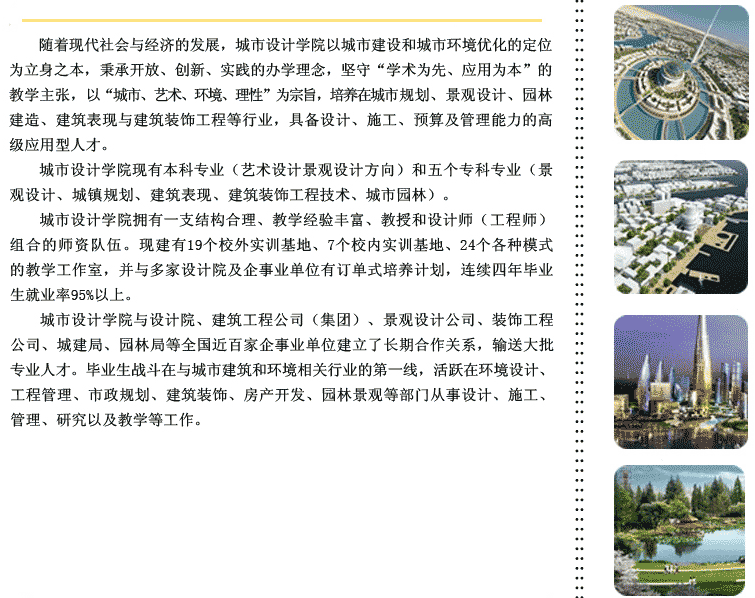 環(huán)境藝術(shù)學(xué)院有環(huán)境藝術(shù)設(shè)計專業(yè)和裝潢藝術(shù)設(shè)計專業(yè),以培養(yǎng)創(chuàng)新應(yīng)用型人才為目標(biāo),重視實踐性教學(xué)環(huán)節(jié),畢業(yè)生能熟練應(yīng)用所學(xué)知識從事室內(nèi)外環(huán)境設(shè)計、建筑裝飾設(shè)計、建筑表現(xiàn)等領(lǐng)域的工作。