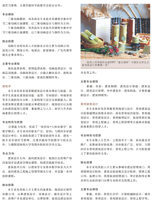 ,構(gòu)建了理論教學(xué)、實(shí)踐教學(xué)、素質(zhì)拓展三大教學(xué)體系,注重課堂教學(xué)改革及教學(xué)評價,實(shí)施實(shí)戰(zhàn)訓(xùn)練項(xiàng)目化,努力探索高等教育大眾化背景下設(shè)計(jì)藝術(shù)類高素質(zhì)應(yīng)用型人才培養(yǎng)模式。近年來,學(xué)生在各級、各類學(xué)科競賽中取得了許多獎項(xiàng),畢業(yè)學(xué)生的綜合素質(zhì)得到社會普遍好評。中國美術(shù)高考網(wǎng)www.brfmcr.cn