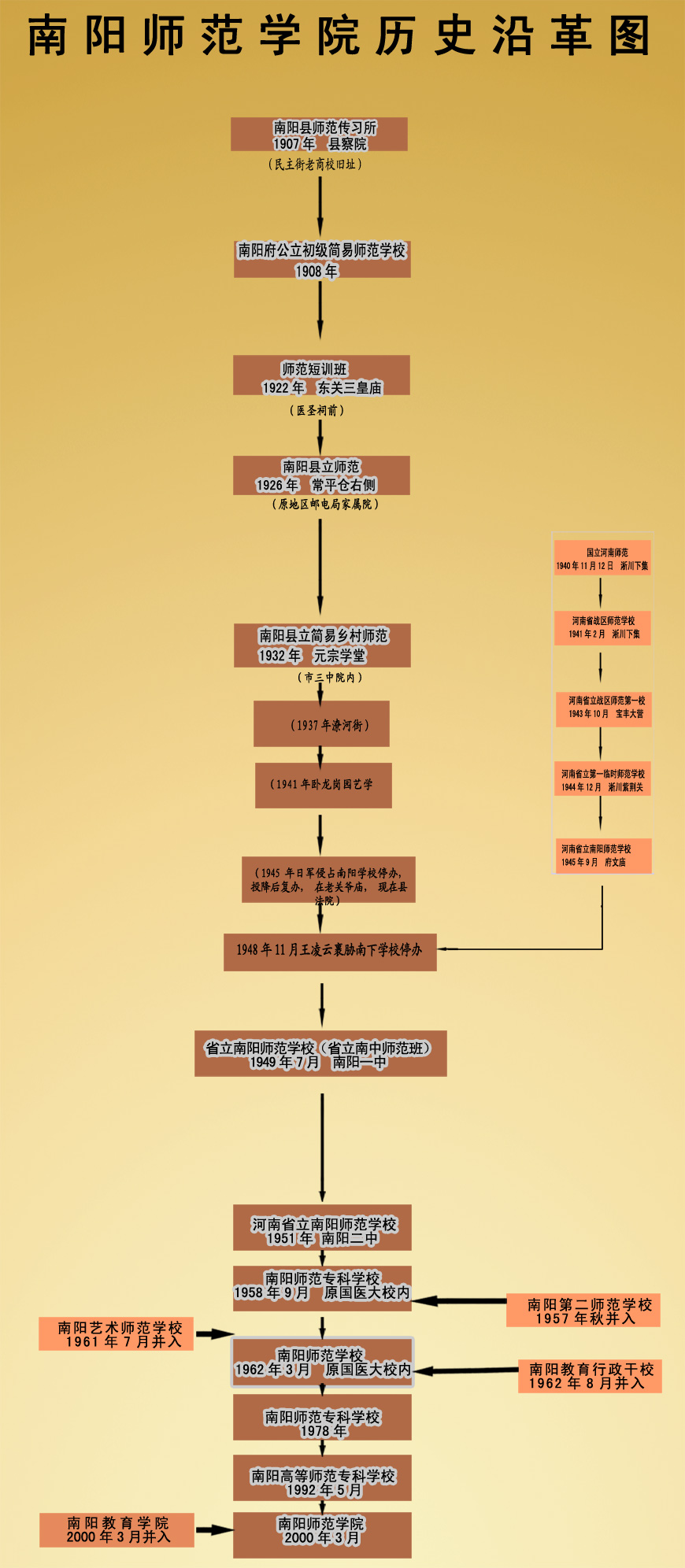 1951年,師范班從省立南陽(yáng)中學(xué)中獨(dú)立出來(lái),成立河南省立南陽(yáng)師范學(xué)校,從此拉開(kāi)了南陽(yáng)師范教育新的篇章。1957年,河南省立南陽(yáng)師范學(xué)校與南陽(yáng)第二師范學(xué)校合并。1958年9月,河南省立南陽(yáng)師范學(xué)校更名為南陽(yáng)師范專(zhuān)科學(xué)校。1961年,南陽(yáng)師范專(zhuān)科學(xué)校與南陽(yáng)藝術(shù)師范學(xué)校合并。1962年3月,南陽(yáng)師范專(zhuān)科學(xué)校更名為南陽(yáng)師范學(xué)校。1962年8月,南陽(yáng)師范學(xué)校與南陽(yáng)教育行政干校合并。1978年,南陽(yáng)師范學(xué)校更名為南陽(yáng)師范專(zhuān)科學(xué)校。1992年5月,南陽(yáng)師范專(zhuān)科學(xué)校更名為南陽(yáng)高等師范專(zhuān)科學(xué)校。2000年3月,經(jīng)國(guó)務(wù)院批準(zhǔn),南陽(yáng)高等師范專(zhuān)科學(xué)校與南陽(yáng)教育學(xué)院合并組建南陽(yáng)師范學(xué)院,成為南陽(yáng)歷史上第一所省屬全日制本科高等學(xué)校,實(shí)現(xiàn)了南陽(yáng)高等教育的歷史性跨越。