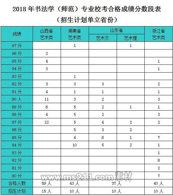 專業(yè)??己细?,文化成績達到考生所在省書法學專業(yè)相關(guān)藝術(shù)類本科同批次最低錄取分數(shù)線的前提下,原則上按綜合成績從高分到低分擇優(yōu)錄取。綜合成績=考生文化成績÷高考文化總分×100×50%+專業(yè)校考成績×50%。當綜合成績相同時,按專業(yè)??汲煽?、文化總分、語文、外語、數(shù)學分數(shù)由高至低依次排序錄取。