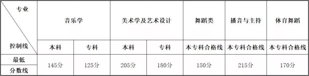 美術(shù)與設(shè)計(jì)學(xué)類本科專業(yè)合格分?jǐn)?shù)線為160分,??茖I(yè)合格分?jǐn)?shù)線為60分,戲劇與影視學(xué)類專業(yè)、舞蹈學(xué)類專業(yè)(含體育舞蹈專業(yè))、播音與主持藝術(shù)專業(yè),本專科合格分?jǐn)?shù)線均為60分。