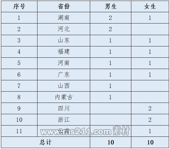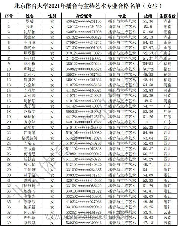 我校2021年播音與主持藝術(shù)專業(yè)共招生20人,合格名單及分省計(jì)劃確定原則是:從中國傳媒大學(xué)播音與主持藝術(shù)專業(yè)部分三試考生中按照專業(yè)成績排序,以男生前10名、女生前10名的省份分布情況確定分省計(jì)劃,根據(jù)不超過分省計(jì)劃數(shù)4倍比例,在相關(guān)省份考生中確定合格名單,詳情見附件。由于云南考生(女)只有3人,因此合格名單(女生)為39人。