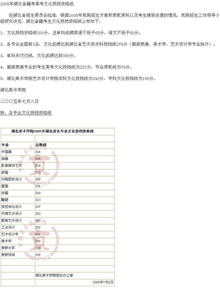 2005年湖北美術(shù)學(xué)院美術(shù)高考錄取分數(shù)線