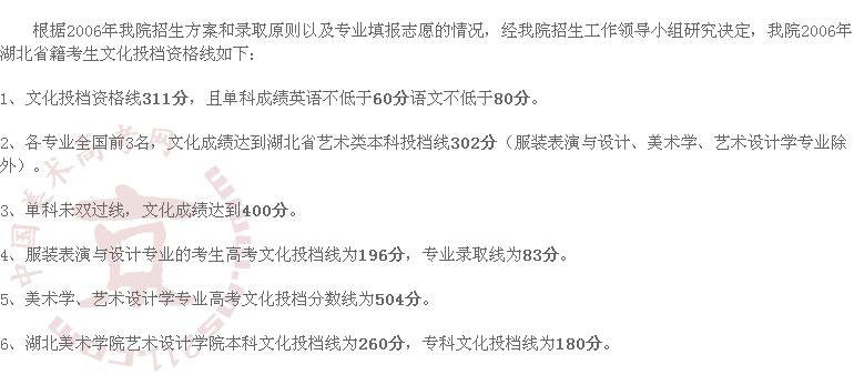 2006年湖北美術(shù)學(xué)院美術(shù)高考錄取分?jǐn)?shù)線