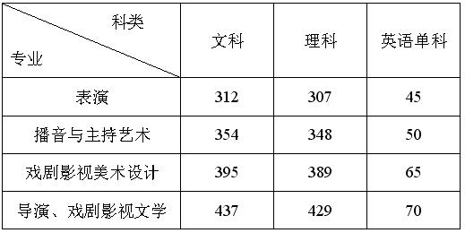 本科專業(yè)考試合格考生,高考成績(jī)總分及英語(yǔ)小分均需達(dá)到中央戲劇學(xué)院規(guī)定的錄取分?jǐn)?shù)線,按專業(yè)考試成績(jī)從高分到低分擇優(yōu)錄取。各專業(yè)文化課錄取分?jǐn)?shù)線如下: