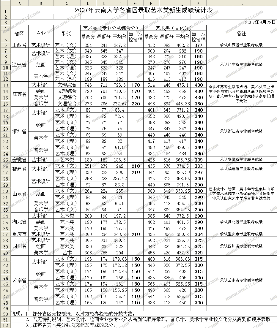 2007年云南大學(xué)美術(shù)高考錄取分?jǐn)?shù)線