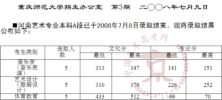2008年重慶師范大學(xué)美術(shù)高考錄取分?jǐn)?shù)線