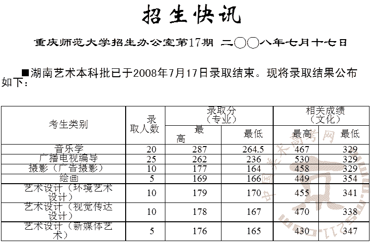 時間:2008-7-17 來源:重慶師范大學招生辦 錄入:ms211中國美術高考網