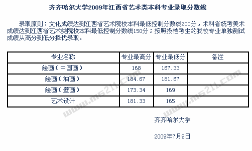 2009年齊齊哈爾大學(xué)美術(shù)高考錄取分數(shù)線