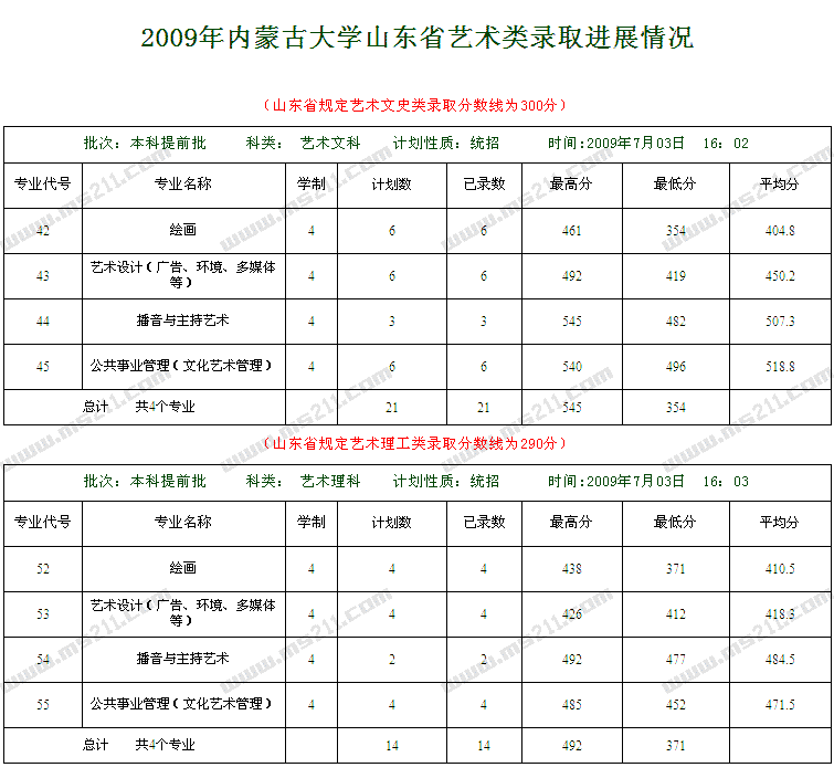 2009年內(nèi)蒙古大學(xué)美術(shù)高考錄取分數(shù)線