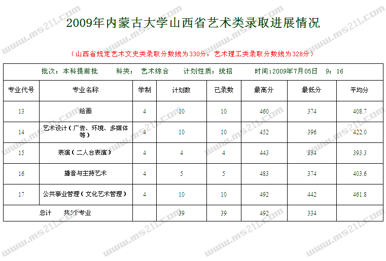 2009年內(nèi)蒙古大學(xué)美術(shù)高考錄取分?jǐn)?shù)線