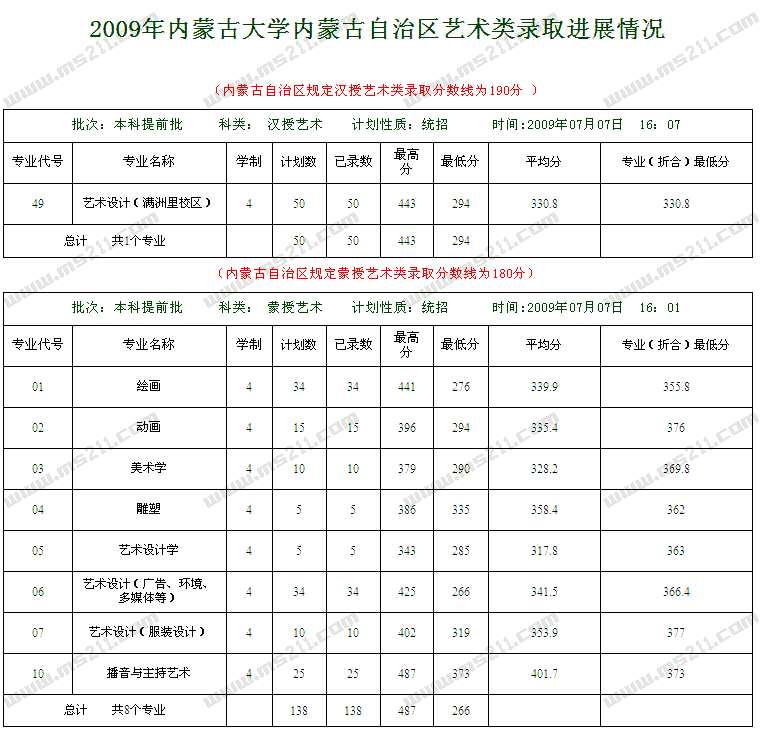 2009年內(nèi)蒙古大學(xué)美術(shù)高考錄取分?jǐn)?shù)線