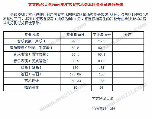 2009年齊齊哈爾大學(xué)江蘇省藝術(shù)類本科錄取分?jǐn)?shù)線