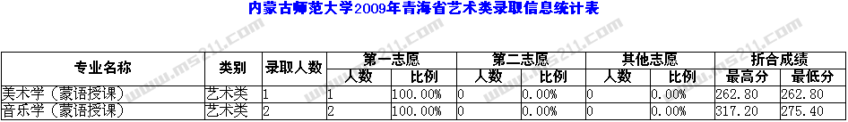 2009年內(nèi)蒙古師范大學(xué)青海省藝術(shù)類錄取線
