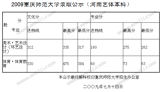 2009年重慶師范大學(xué)美術(shù)高考錄取分?jǐn)?shù)線