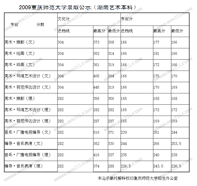 2009年重慶師范大學(xué)美術(shù)高考錄取分?jǐn)?shù)線