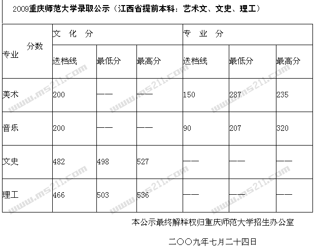 2009年重慶師范大學(xué)美術(shù)高考錄取分?jǐn)?shù)線