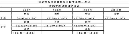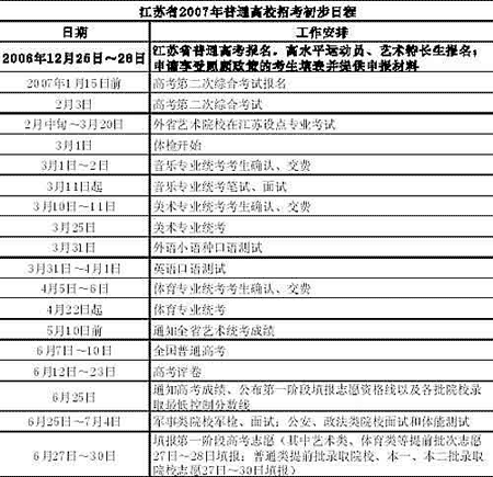 今年,江蘇擬定的高考時間和去年完全一致,仍安排在6月7、8、9和10日上午(具體安排詳見表一)。同時,記者還了解到,2007年江蘇普通高校招生考試簡明日程也已確定公布(詳見表二)。(通訊員:沈考宣 記者:謝靜嫻)