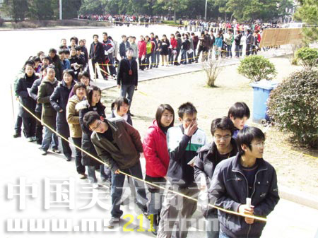 昨天上午,記者來到八大關賓館小禮堂,遠遠就看到排著近百米長隊報名的藝術考生,F(xiàn)場維持秩序的招考工作人員告訴記者,從昨天凌晨4時許就有學生排隊了。