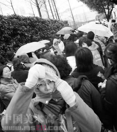 昨天是我省普通高校美術(shù)類專業(yè)統(tǒng)考報名的第一天。早上7時多,記者來到浙工大報名點時,長長的隊伍已經(jīng)從體育館門口延伸到拐角處,足有三四百米長。10多名裹著棉衣的保安在現(xiàn)場維持秩序,隊伍里不時有人打著哈欠。