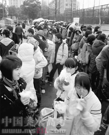 “我在寧波讀書,到杭州學(xué)畫3個多月,我凌晨4點多就來了,沒想到還是排在第二方陣,更早那些人都在體育館里排著了。”站在隊伍最前面的鐘同學(xué)對記者說。