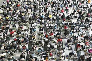 山東“藝考”十分火爆!2月20日,山東省工藝美術(shù)學(xué)院將考場搬進(jìn)了2萬多平方米的濟南市舜耕會展中心,7000多名美術(shù)類專業(yè)考生在這里參加考試。2008年山東報名參加普通高校藝術(shù)招生考試的人數(shù)達(dá)到16.1萬。