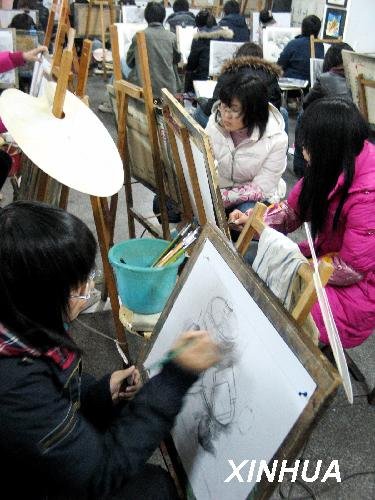 資料圖片:2008年12月18日,學(xué)生們在濟(jì)南一家美術(shù)培訓(xùn)班里進(jìn)行最后階段的沖刺練習(xí)。當(dāng)日,距山東藝考美術(shù)類統(tǒng)考還有10天,這里的學(xué)生每天都要進(jìn)行近14個小時的練習(xí)。據(jù)了解,今年共有5.4萬考生報名參加山東2009年美術(shù)類專業(yè)高考,較去年的9.05萬人減少3.65萬,降幅達(dá)40%以上。嚴(yán)峻的就業(yè)形勢及首次實行的統(tǒng)考政策使許多學(xué)生放棄報名。新華社發(fā)(趙曉明攝)