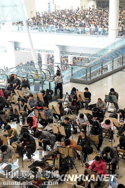 2月5日上午8點整,山東省2009年藝術類考生藝術專業(yè)考試正式拉開帷幕。山東工藝美術學院由于考生人數眾多,將考場搬進了20000余平方米的濟南市舜耕會展中心,讓近7000多名美術類專業(yè)考生在展廳內同時參加考試,一展身手。