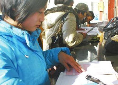 2009年12月17日是西藏2010年普通高等學(xué)校招生藝術(shù)類專業(yè)加試報(bào)名的第一天。據(jù)市招生辦公室高招負(fù)責(zé)人張耿蓉介紹,當(dāng)天前來(lái)報(bào)名的考生有近150名。其中,往屆生和社會(huì)考生有20多人,其他的都是以學(xué)校為單位集體報(bào)名的考生。(圖片來(lái)源:《拉薩晚報(bào)》)