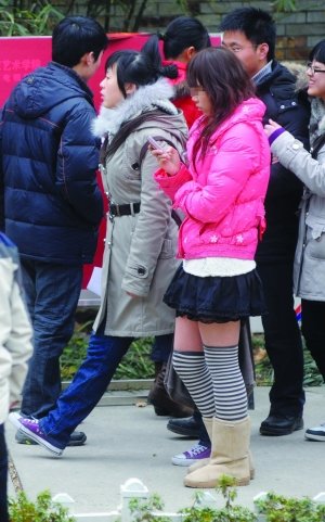南京藝術(shù)學(xué)院藝術(shù)專業(yè)?紙竺牡谝惶。從凌晨三四點開始,學(xué)生們就從全國各地趕來“追夢”。雖說是嚴(yán)冬,但這些“90后”的俏麗女孩卻美麗“凍”人,甚至還光腿穿著超短裙。不少女孩化著濃妝,涂著鮮艷的指甲油,再配上卷發(fā),看起來十分成熟。