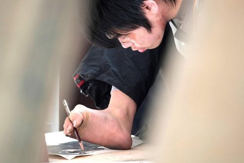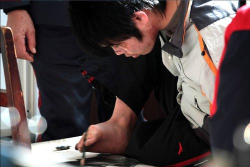 考點(diǎn)保安將劉凱健背進(jìn)考場。身殘志堅(jiān)的劉凱健憑著頑強(qiáng)的毅力,不僅用腳學(xué)會了穿衣、吃飯,還重返校園,并萌發(fā)對書法、繪畫的興趣,開始在專業(yè)老師指導(dǎo)下專修繪畫。 (圖2)