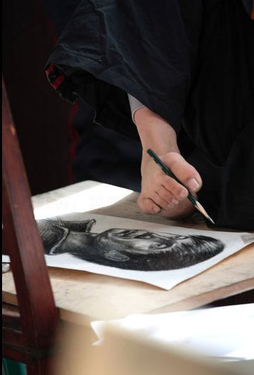 1月25日,2010年江蘇省外普通高校藝術(shù)類專業(yè)招生考試(美術(shù)類)南通考點(diǎn)迎來一名特殊考生-劉凱健。2002年,因?yàn)橛娩X合金條挑掛在高壓線上的一只風(fēng)箏,江蘇啟東13歲的少年劉凱健被大火大面積燒傷,并失去了雙手、一只左腿。(圖1)