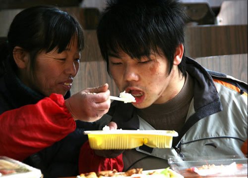 媽媽張美芳在休息室里在給兒子喂午飯,準(zhǔn)備下午的考試。 (圖6)