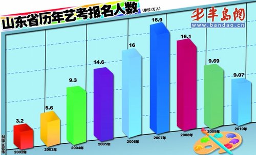 根據(jù)統(tǒng)計(jì),我省的藝考報(bào)名人數(shù)2002年為3.2萬(wàn)人,2003年達(dá)到5.6萬(wàn)人,2004年猛增至9.3萬(wàn)人,2005年為14.6萬(wàn)人,2006年報(bào)考人數(shù)超過(guò)16萬(wàn),2007年達(dá)到最高的16.9萬(wàn)人,2008年藝考報(bào)名人數(shù)開(kāi)始減少,為16.1萬(wàn)人,2009年又降了近7萬(wàn)人,重回10萬(wàn)人大關(guān)內(nèi)。