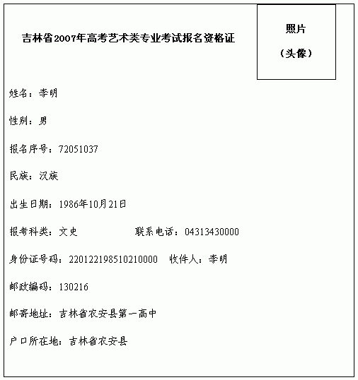2.《吉林省2007年高考藝術(shù)專業(yè)考試報名資格證》樣表