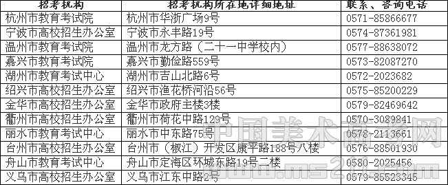 四、考點(diǎn) 2010年我省普通高校招生美術(shù)類(lèi)專(zhuān)業(yè)省統(tǒng)考統(tǒng)一由全省11個(gè)設(shè)區(qū)市和義烏市招生考試機(jī)構(gòu)(以下稱(chēng)有關(guān)市招考機(jī)構(gòu))組織實(shí)施,并在市政府所在地設(shè)立考點(diǎn),有關(guān)市招考機(jī)構(gòu)如下: