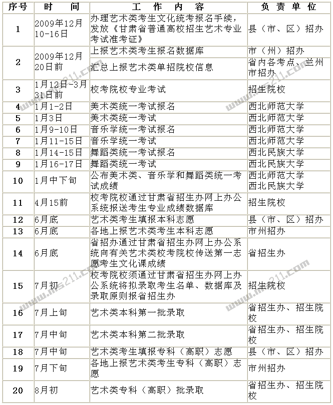 2、2010年甘肅省普通高校藝術(shù)類專業(yè)招生工作進程表