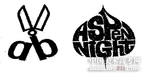 圖形題目:圖例是兩幅用英文字母變化而成的具象圖形(剪刀和樹葉)。請參照圖例。另設(shè)計兩幅以英文字母組合或變化而成的具象圖形,表現(xiàn)生活中常見的事物。