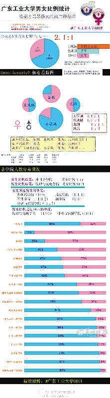 事實(shí)是否真的如此?2月2日晚,校園微博“廣東工業(yè)大學(xué)GDUT”根據(jù)廣工教務(wù)處于去年12月26日公布的“廣東工業(yè)大學(xué)普通全日制本、?茖W(xué)生人數(shù)統(tǒng)計(jì)表”,統(tǒng)計(jì)出一份關(guān)于廣工男女比例的“權(quán)威”數(shù)據(jù)圖。上面的數(shù)據(jù)顯示,廣工真實(shí)的男女生比例并不是夸張的13:1,而是2.1:1,其中大學(xué)城校區(qū)為4:1,龍洞校區(qū)為1:1.1,東風(fēng)東路校區(qū)1.1:1,該數(shù)據(jù)圖精確到每個(gè)學(xué)院和校區(qū)的具體人數(shù)和比例。博主表示,發(fā)布這一圖表的初衷,就是為了消滅一些關(guān)于“廣工男女生嚴(yán)重失衡”的謠言。