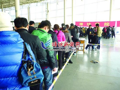 2月19日上午11時(shí)許,在富華國際展覽中心南門附近,兩列長達(dá)百米的報(bào)名隊(duì)伍格外引人注目,這些學(xué)生都在等著報(bào)考濰坊學(xué)院。每名排隊(duì)的考生手中都有一份“報(bào)考專業(yè)登記表”,上面寫有考生的考生號(hào)、姓名、報(bào)考專業(yè)、兼報(bào)專業(yè)、是否需要伴奏等內(nèi)容。