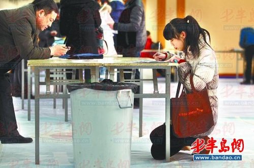 盞吹吹謀名大廳里,一名考生蹲著填寫報(bào)名信息。
