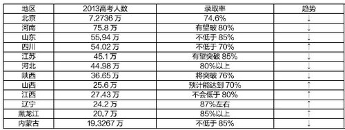 2013年全國高考報(bào)名考生共912萬人。從已公布的省份招生部門透露計(jì)劃情況來看,約七成省份錄取率或能超80%。