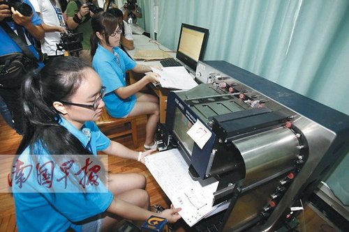 據(jù)悉,6月7日下午,在結(jié)束上午語(yǔ)文科考試后,答題卡就被陸續(xù)運(yùn)往評(píng)卷點(diǎn)進(jìn)行掃描。今年評(píng)卷點(diǎn)使用了8臺(tái)國(guó)內(nèi)最先進(jìn)的高速掃描閱讀機(jī)(并配備了2臺(tái)備用機(jī)),每臺(tái)每小時(shí)掃描數(shù)能達(dá)3000至4000張,記者在現(xiàn)場(chǎng)的電腦上看到,掃描的圖像非常清晰。