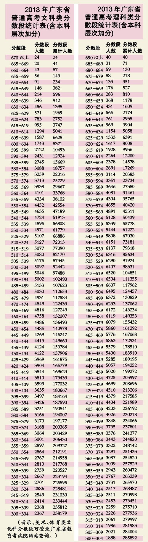 文科考生中,660分以上者為87人,其中670分以上有24人,去年660分以上考生人數(shù)只有43人;理科考生中,680分以上有130人,其中690分以上有40人,而2012年680分以上考生有133人,其中690分以上考生54人。