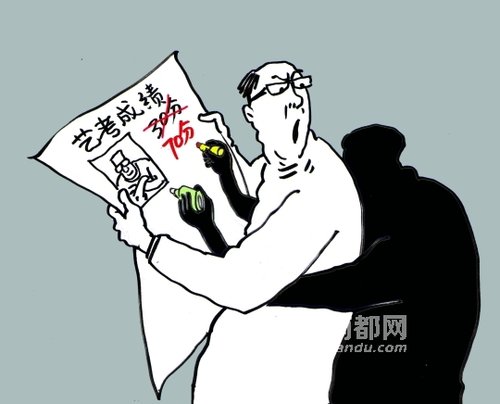 今年6月1日,暨南大學(xué)一位老師舉報(bào),稱其作為2013年暨大藝考的考官之一,自己所評(píng)定的成績?cè)獾酱鄹模静豢赡苣玫剿嚳己细褡C的考生卻進(jìn)入了最終的名單。該老師稱,有幾名考生在以很低的筆試成績進(jìn)入面試、兩位老師給了0分或30多分面試低分的情況下,依然全部入圍錄取名單,30多分變成了70多分。