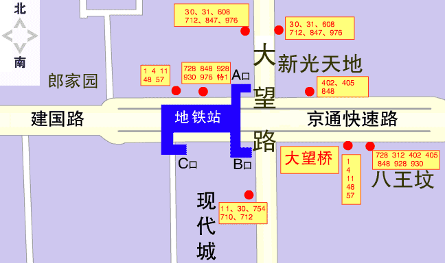 地鐵一號線大望路站B口(現(xiàn)代城側(cè))出站向東走,在大望橋東南角換815路汽車(向東方向行駛)。